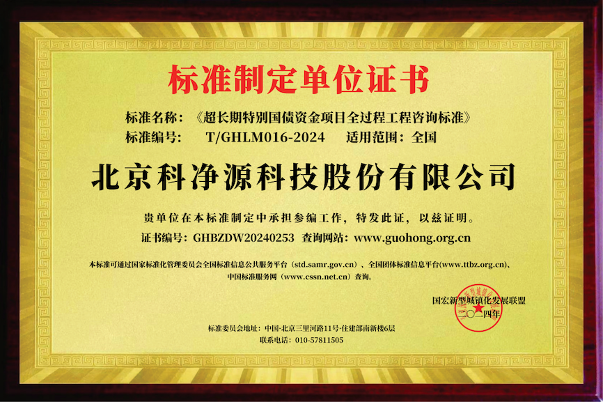 日前,由我司(北京科凈源科技股份有限公司,簡稱“科凈源”)作為主要參編單位參與編制的《T/GHLM016-2024 超長期特別國債資金項目全過程工程咨詢標(biāo)準(zhǔn)》自2024年8月1日起正式發(fā)布實施。